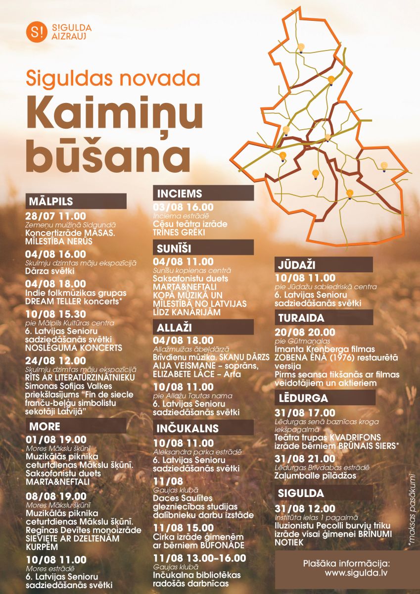 Visu aizsāksim ar koncertizrādi “Māsas. Mīlestība nerūs” 28. jūlijā plkst. 11.00 Mālpilī, Sidgundas Zemeņu muižiņā. Mālpilī pasākumi turpināsies visu augustu – 4. augustā Skulmju dzimtas māju ekspozīcijā plkst. 16.00 tiks svinēti Dārza svētki, bet vakara turpinājumā plkst. 18.00 notiks indie folkmūzikas grupas “Dream Teller” koncerts. Biļetes cena koncertam – 10 eiro,