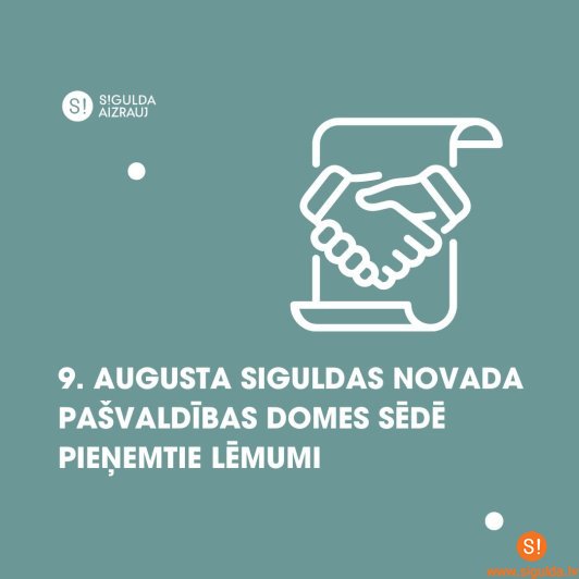 Piektdien, 9. augustā, norisinājās Siguldas novada pašvaldības domes sēde, kurā izskatīti trīs lēmumprojekti. Plašāka informācija par sēdes norisi un lēmumiem pieejama pašvaldības tīmekļa vietnes sadaļā “Domes sēdes”.