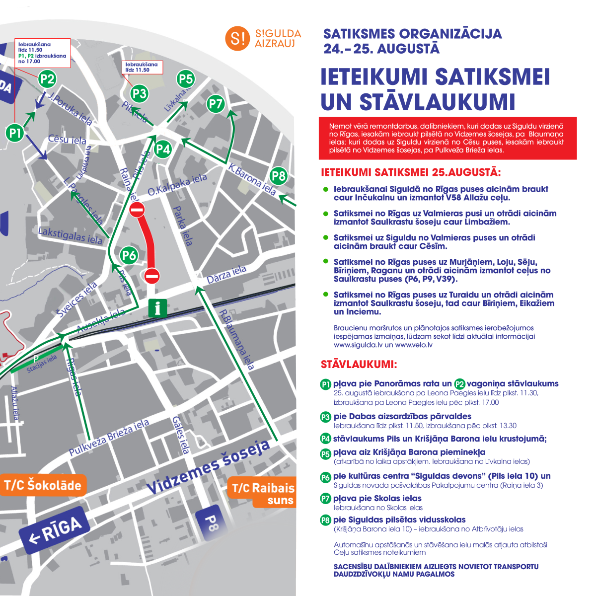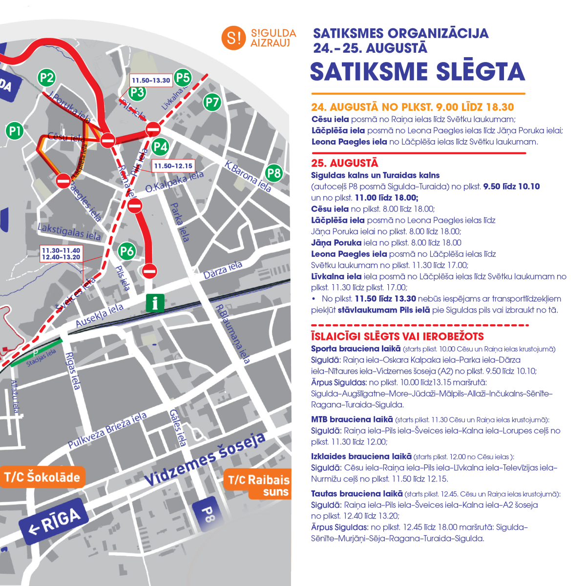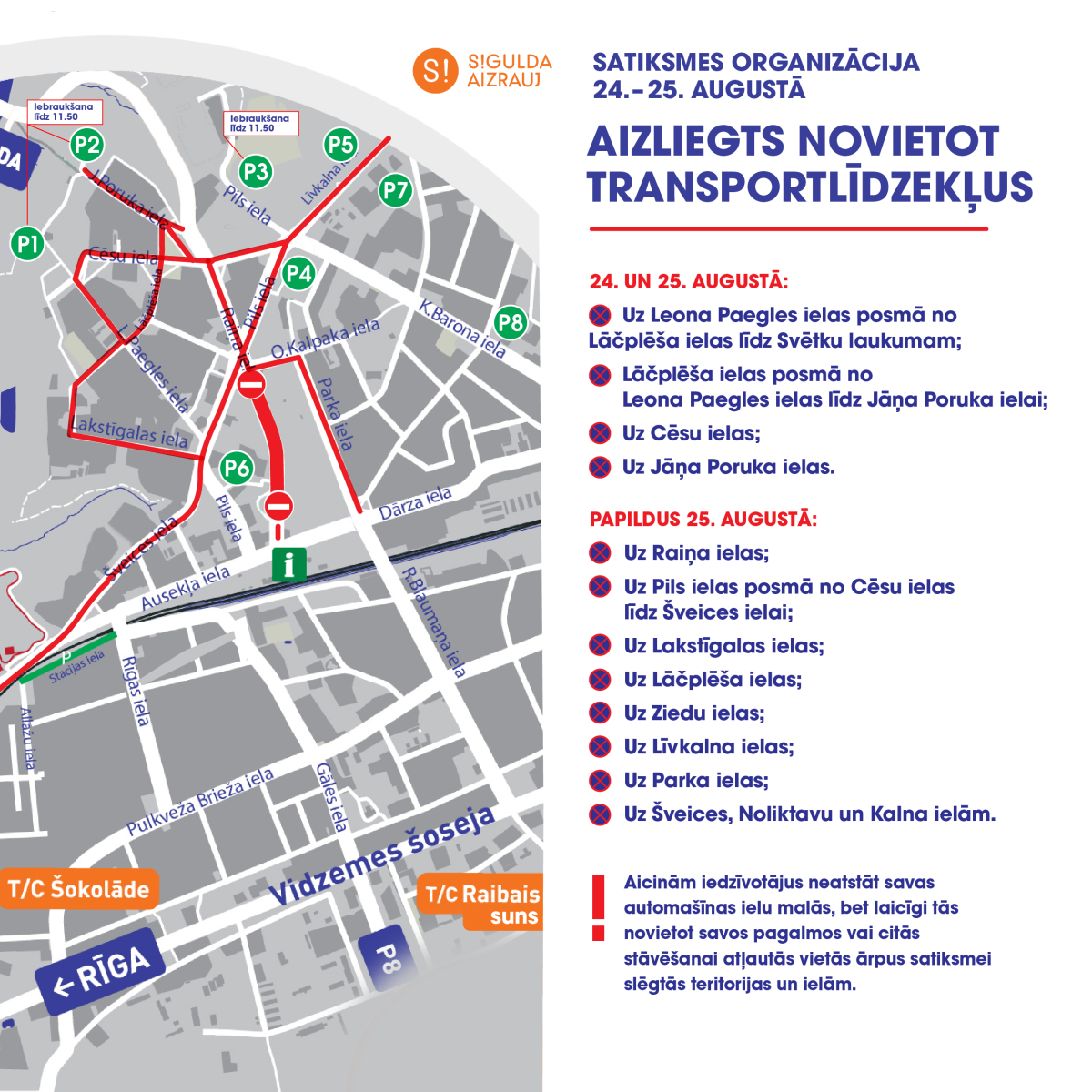 - plkst. 11.50–13.30 nebūs iespējams ar transportlīdzekļiem piekļūt stāvlaukumam Pils ielā pie Siguldas pils vai izbraukt no tā.