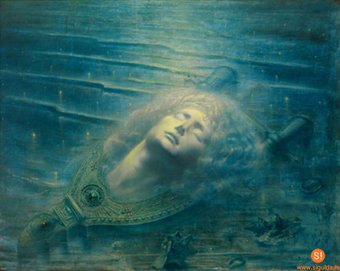 Attēlā: beļģu simbolista Žana Delvila (Jean Delville, 1867–1953) glezna “Mirušais Orfejs” (Orphée mort, 1893).
