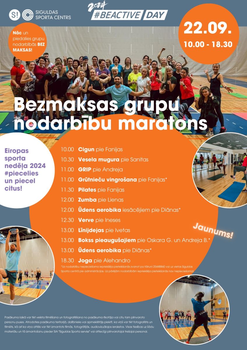 #BEACTIVE Eiropas sporta nedēļas ietvaros, 22. septembrī, Siguldas Sporta centrā norisināsies bezmaksas grupu nodarbību maratons.Eiropas sporta nedēļas sauklis ir “Piecelies un piecel citus”, tādēļ Siguldas Sporta centrs aicina ikvienam ņemt līdzi draugus un ģimeni, un aktīvi pavadīt svētdienu.