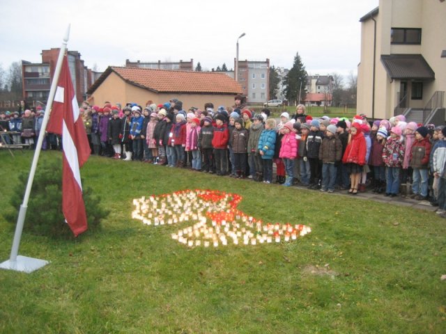 Taču 17.novembra rītā pie mazās skolas viena pēc otras sāka mirdzēt degošas svecītes Latvijas kontūrā. Vairāk kā 300 degošu liesmiņu sildīs Latviju. Tās mazo bērnu sirsniņu liesmiņas. 2.b klases skolēni veidoja pogu mozaīkas Latvijas kontūru, apliecinot, cik krāsaina un daudzveidīga tā ir.