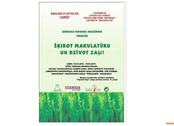 Siguldas pilsētas SIA „Jumis” sadarbībā ar Latvijas zaļo punktu, piedzīvojumu parku „Mežakaķis” un laikrakstu „Siguldas elpa” aicina Siguldas novada skolēnus šķirot makulatūru un dzīvot zaļi.