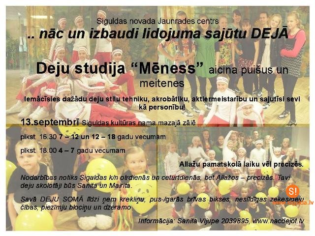 Bērni, jaunieši un viņu vecāki tiek aicināti 13. septembrī Siguldas kultūras namā iepazīties ar deju studiju “Mēness” un tās vadītāju Sanitu Vijupi. Plkst.16.30 tiks gaidīti 7-12 gadus vecie dejot gribētāji un arī 12 – 18 gadus vecie. Savukārt plkst.18.00 tiks gaidīt bērni vecumā no 4-7 gadiem. Nodarbības notiks otrdienās un ceturtdienās pa vecuma grupām iepriekš minētajos laikos. Nodarbības paredzētas arī Allažu pamatskolā, laiki vēl tiks precizēti. Papildus informācija zvanot pa tālruni 20398959 - Sanitai.