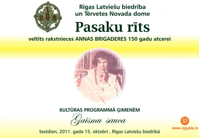 15.oktobrī Siguldas Jauniešu iniciatīvu centra „Mērķis” dalībnieki dosies uz Rīgas Latviešu biedrības namu, lai piedalītos Folkloras komisijas rīkotajā „Pasaku rītā” kultūras programmā „Gaismu sauca”, kas šogad veltīta A. Brigaderes 150 gadu atcerei.