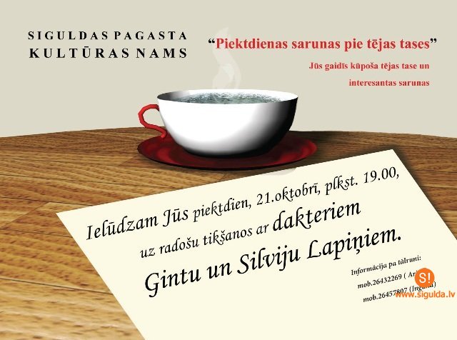 21.oktobrī plkst.19.00 Siguldas pagasta kultūras nams aicina apmeklēt tikšanos ar ārstiem, ginekologiem no Valmieras Gintu un Silviju Lapiņiem ciklā „Piektdienas sarunas pie tējas tases”.