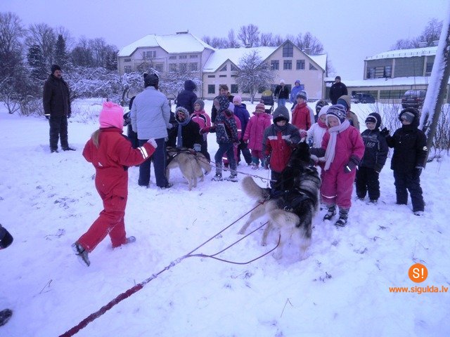 Pie pirmklasniekiem Allažos bija atbraukuši seši haskiju šķirnes mīluļi, kas izvizināja mazos pa sniegotajiem laukiem suņu pajūgā. Suņi bija ļoti draudzīgi - ļāvās paglāstīt, pabužināt. "Darbā" haskiji rāvās ar tādu prieku, ka skaidrs, šiem suņiem ziema un sniegs ir liela izprieca, tāpat kā mazajiem allažniekiem.