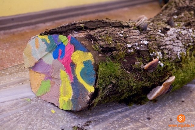 Mākslu skolas ”Baltais flīģelis” Mākslas nodaļas pedagogi Agita Zālīte, Eva Brempele, Ieva Vanaga un Raits Tikums interaktīvā radošā darbnīcā palīdzēja ikvienam interesentam ļauties krāsu priekam uz savdabīgā dabas materiāla.