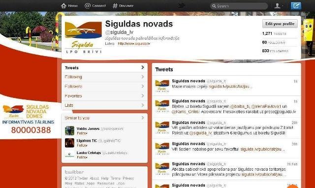 „Twitter vietnē @sigulda_lv tiek publicēta informācija par svarīgākajām pašvaldības aktivitātēm, novada kultūras un sporta pasākumiem, tādā veidā popularizējot arī pašvaldības mājas lapu www.sigulda.lv, kas ir plašākais informācijas resurss Siguldas novadā,” skaidro pašvaldības Sabiedrisko attiecību nodaļas speciālisti.