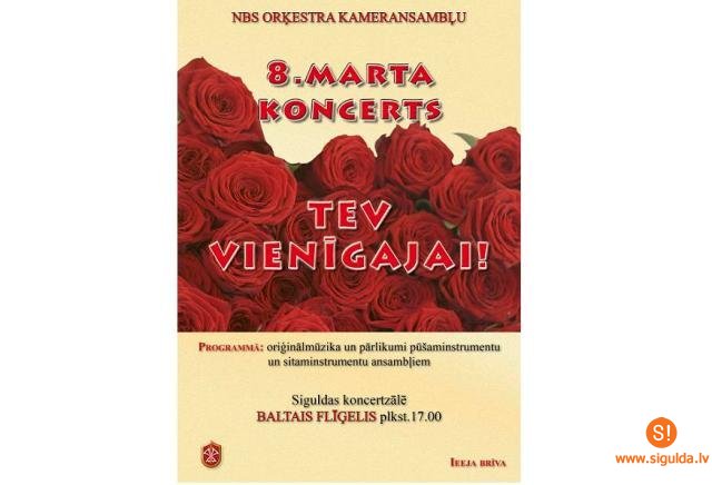 Sagaidot Starptautisko sieviešu dienu, Nacionālo bruņoto spēku (NBS) orķestris sagatavojis skaistu muzikālu dāvanu. 8.martā plkst.17.00 NBS orķestra kameransambļi ielūdz visas daiļā dzimuma pārstāves uz svētku koncertu „Tev vienīgajai!” Siguldas koncertzālē „Baltais Flīģelis”.