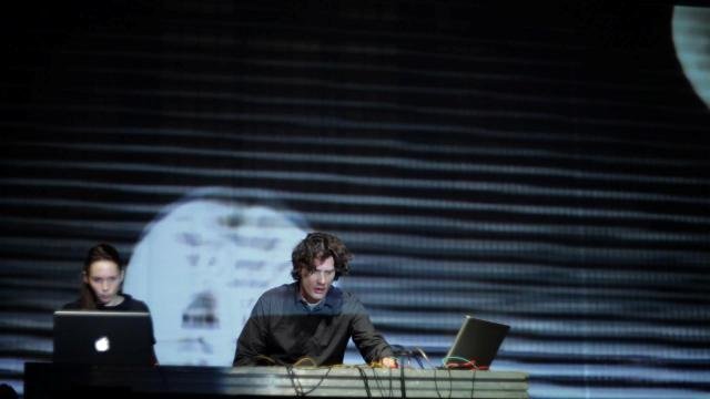 Komponists ANDRIS INDĀNS. Multimediju mākslinieces KATRĪNAS NEIBURGAS videoprojekcijas. Elektroniskās mūzikas projekta Gas of Latvia programma "Compressor".