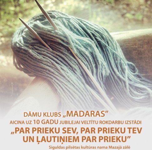 Sestdien, 11.augustā plkst.12.00 Siguldas pilsētas kultūras nama Mazajā zālē tiks atklāta dāmu kluba „Madaras” rokdarbnieču izstāde „Par prieku sev, par prieku tev un ļautiņiem par prieku”. Šī izstāde ir ievērojama ar to, ka tiek atzīmēta arī dāmu kluba 10 gadu pastāvēšanas gadadiena.