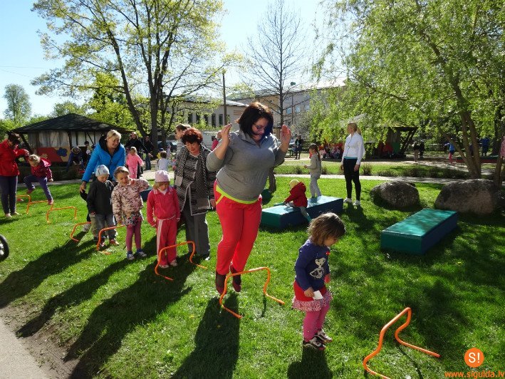 Pasākumā bērni ar vecākiem piedalījās dažādās sportiskās un ar sporta veidiem saistītās aktivitātēs – leca, skrēja, pārvarēja šķēršļu joslas, makšķerēja, spēlēja florbolu un dvieļu bolu, noskaidroja sporta veidiem nepieciešamos atribūts, kā arī izveidoja sporta veidu nosaukumus no burtu kartītēm.