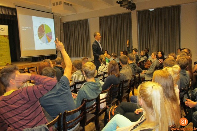 9.oktobrī sirsnīgā un neformālā gaisotnē Siguldas Valsts ģimnāzijas zālē ap astoņdesmit ģimnāzijas un Pilsētas vidusskolas skolēni tikās ar Siguldas Uzņēmējdarbības atbalsta punkta vadītāju Inu Stupeli, informāciju tehnoloģiju (IT) uzņēmuma SIA „DPA” valdes locekli Sandi Kolomenski un Siguldas novada uzņēmējiem, lai uzzinātu par projektu “Start UP’’. Šī projekta ietvaros paredzēta uzņēmēju un skolēnu radoša sadarbība IT jomā.
