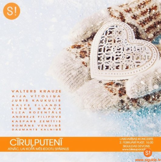 Svētdien, 2. februārī, plkst. 16.00 kultūras centrā “Siguldas devons” notiks labdarības koncerts “Cīruļputenī”, kurā uzstāsies Valters Krauze un draugi, aicinot ikvienu būt kopā, lai palīdzētu bērniem, kuriem ir nepieciešama nopietna ārstēšana. Visi...