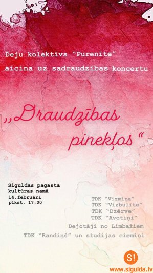 Piektdien, 14. februārī, plkst. 17.00 Siguldas pagasta Kultūras namā norisināsies tautas deju koncerts “Draudzības pinekļos”, kurā deju kolektīvi izdejos XII Latvijas skolu jaunatnes dziesmu un deju svētku “Nāc gavilēt” repertuāru.