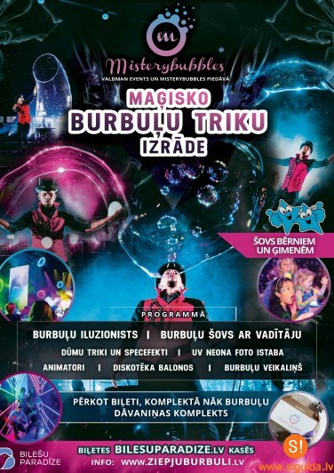 Siguldas pagasta Kultūras namā 27. novembrī plkst. 18.30 notiks burbuļu triku izrāde “Mistery Bubbles”. Šovs ir piemērots ģimenēm ar bērniem, un tajā gaidāms burbuļu iluzionists, neona istaba, dūmu specefekti, burbuļu triki, animatori, vakara vadītājs ar rotaļām un...