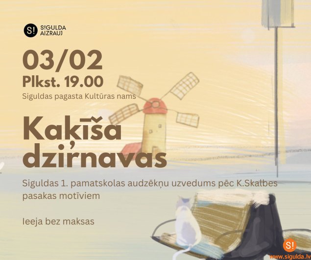 Siguldas 1. pamatskolas audzēkņi aicina uz izrādi “Kaķīša dzirnavas” 3. februārī plkst. 19.00 Siguldas pagasta Kultūras namā.