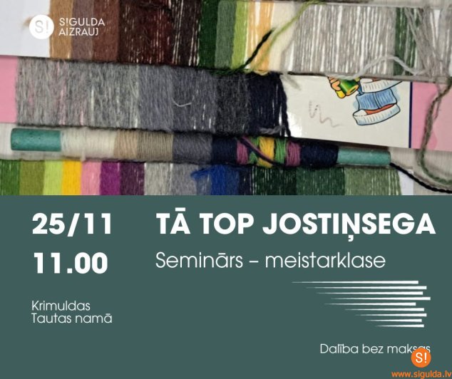 Sestdien, 25. novembrī, plkst. 11.00 Krimuldas Tautas namā notiks seminārs-meistarklase “Tā top jostiņsega”, kas veltīta Siguldas novada Nemateriālā kultūras mantojuma sarakstā iekļautās vērtības “Jostiņsegu aušana rakstainā audu ripsa tehnikā”...