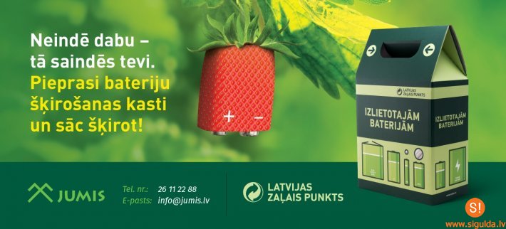 Veicinot dažādu atkritumu veidu šķirošanu un nonākšanu pārstrādē, vides apsaimniekošanas uzņēmums Siguldas pilsētas SIA “Jumis” kampaņas “Neindē dabu – tā saindēs Tevi” ietvaros aicina Siguldas novada uzņēmumus un iestādes pieteikties...