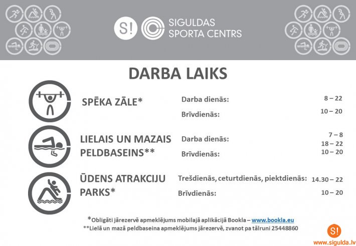 Saistībā ar valstī izsludināto ārkārto situāciju, Siguldas Sporta centrs veicis izmaiņas darba laikā. Turpmāk Siguldas Sporta centrs darbdienās būs atvērts līdz plkst. 21.00, bet sestdienās un svētdienās – no plkst. 10.00 līdz 20.00.